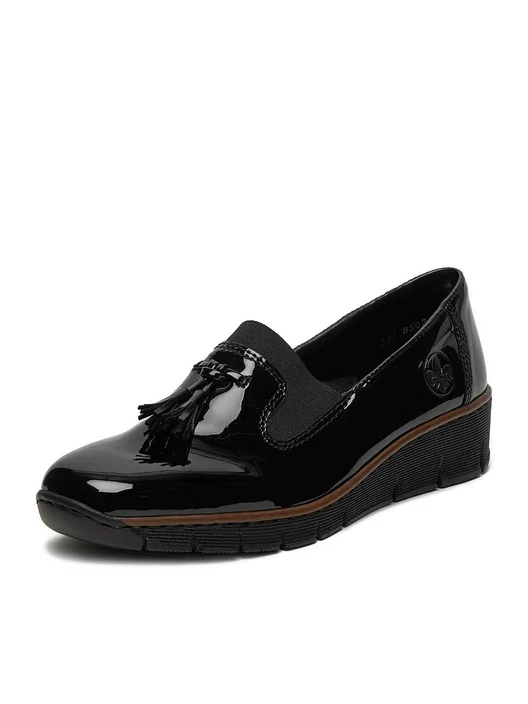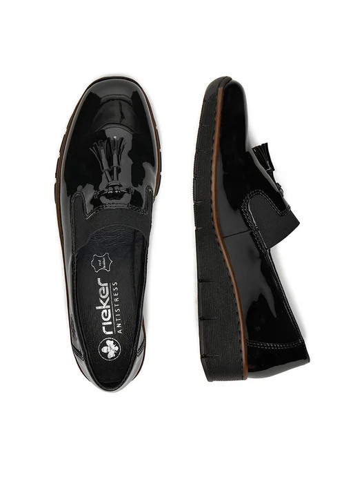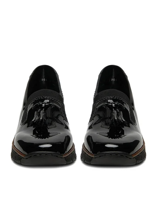 Μοκασίνι Rieker σε μαύρο λουστρίνι.Αντιολισθητική σόλα εσωτερικός μαλακός πάτος και μικρή πλατφόρμα 3,5 εκ.Συνδυασμός κομψότητας και άνεσης σε ενα παπούτσι.